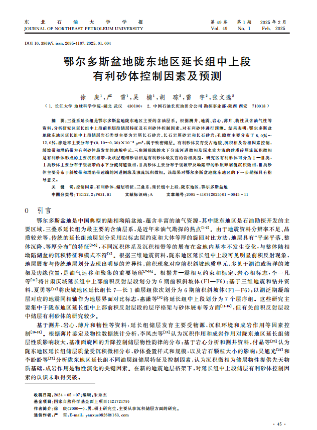 硕士生徐庚在《东北石油大学学报》上发表题为“鄂尔多斯盆地陇东地区延长组中上段有利砂体控制因素及预测”的研究论文。色情影片