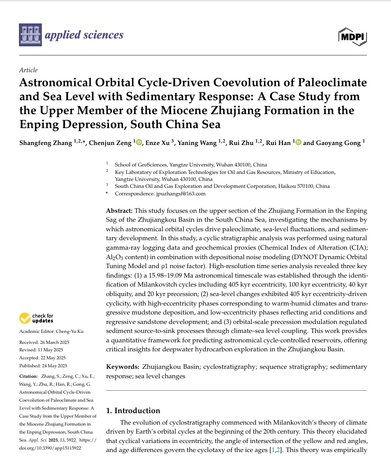 张尚锋教授在《Applied sciences》上发表题为“Astronomical Orbital Cycle-Driven Coevolution of Paleoclimate and Sea Level with Sedimentary Response: A Case Study from the Upper Member of the Miocene Zhujiang Formation in the Enping Depression, South China Sea”的研究论文。色情影片