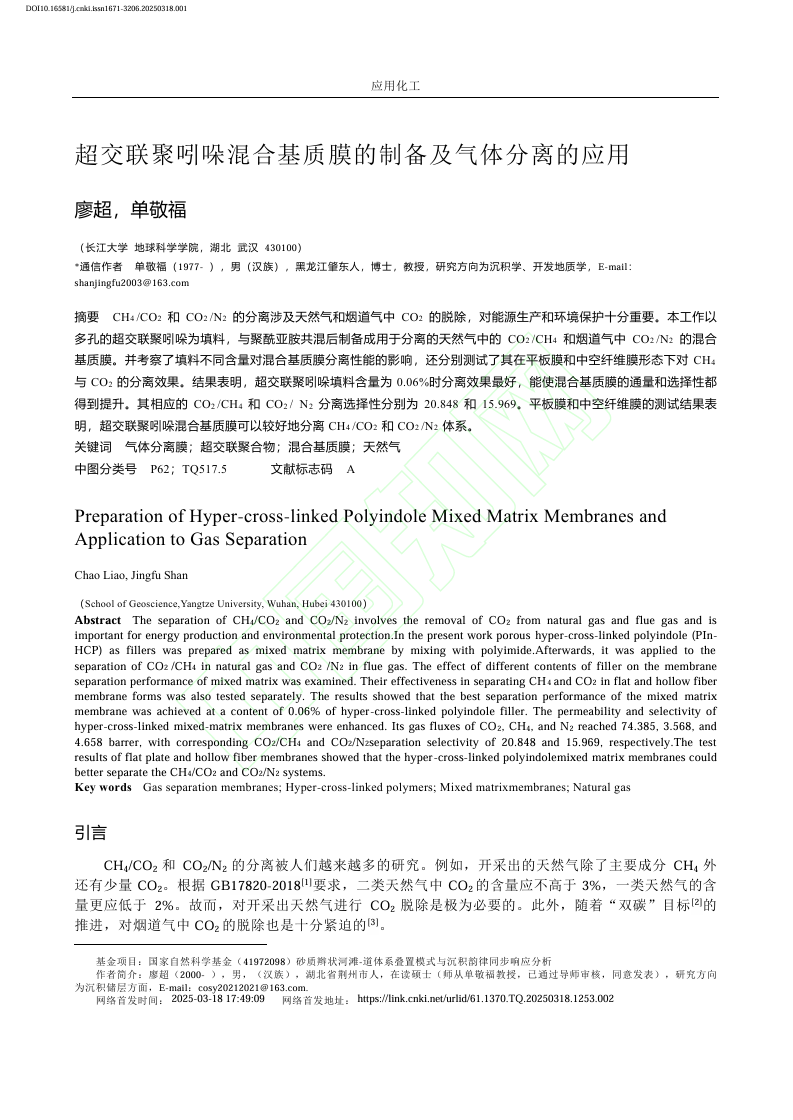 硕士生廖超在中文核心期刊《应用化工》上发表题为“超交联聚吲哚混合基质膜的制备及气体分离的应用”的研究论文。该论文以多孔的超交联聚吲哚为填料,与聚酰亚胺共混后制备成用于分离的天然气中的CO2/CH4和烟道气中CO2/N2的混合基质膜。色情影片