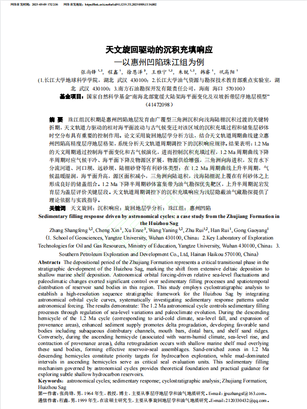 色情影片 张尚锋教授在《断块油气田》上发表题为“天文旋回驱动的沉积充填响应—以惠州凹陷珠江组为例”的研究论文。色情影片 为论文第一署名单位,张尚锋教授为论文第一作者,硕士生程鑫为该文通讯作者。该项研究得到国家自然科学基金“南海北部宽缓大陆架海平面变化及双坡折带层序地层模型”的资助。