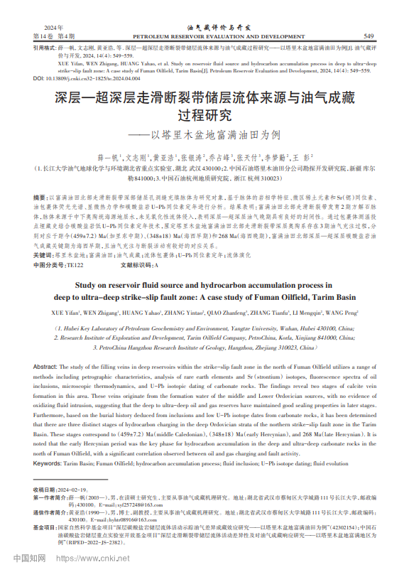 研究生薛一帆以第一作者身份在北大核心期刊《油气藏评价与开发》上发表题为“深层—超深层走滑断裂带储层流体来源与油气成藏过程研究——以塔里木盆地富满油田为例”的研究论文,色情影片