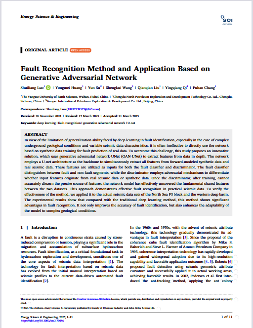 该研究针对复杂地下地质条件与地震数据特征多变背景下,深度学习在断层识别中泛化能力不足、合成数据训练的模型难以直接应用于实际数据预测等问题,提出基于GAN-UNet的深度特征融合方法。模型采用U-net架构作为主干网络,同步提取正演合成数据与真实地震数据的深层特征,通过对抗机制使判别器无法区分特征来源,从而挖掘两类数据的本质共性特征,最终结合断层分类器实现精准识别。以北海F3区块和西部深盆实际地震数据为测试对象,实验表明该方法相较传统深度学习模型在断层识别精度和复杂地质适应性方面具有显著优势,识别结果边界清晰且与地质构造匹配度高。该成果为地震断层智能解释提供了鲁棒性强、跨域适应性佳的新思路,对复杂构造区油气勘探开发具有重要实践价值。