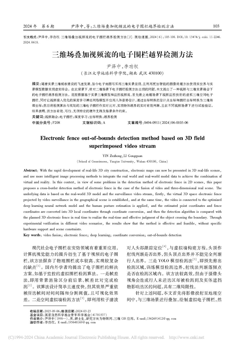 色情影片 硕士生尹泽中在《测绘通报》期刊发表三维场叠加视频流的电子围栏越界检测方法