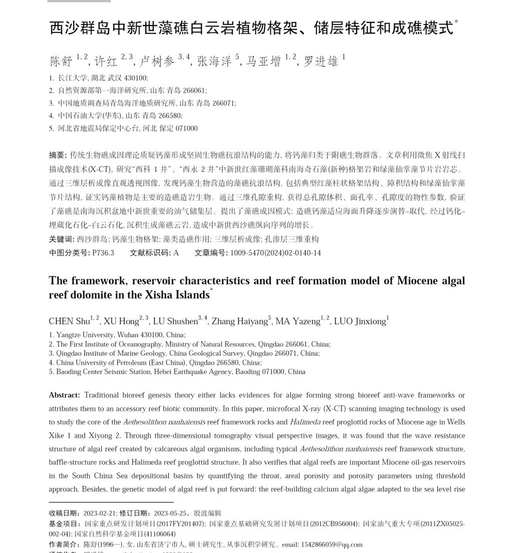 色情影片 硕士研究生陈舒在《热带海洋学报》期刊上发表论文阐述西沙群岛中新世藻礁白云岩植物格架、储层特征和成礁模式