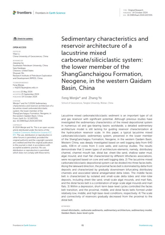 色情影片 教师冯文杰在《Frontiers in Earth Science》上发表题为“Sedimentary characteristics and reservoir architecture of a lacustrine mixed carbonate/siliciclastic system: the lower member of the ShangGanchaigou Formation, Neogene, in the western Qaidam Basin, China”的研究论文。该论文针对柴达木盆地西部地区新近系上干柴沟组下段混积体系开展野外露头无人机倾斜摄影建模与解剖、地下储层表征,明确了油田开发尺度下,混积体系沉积特征与沉积模式。