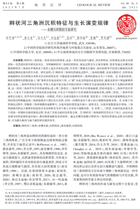 色情影片 本科生何艺玮在《地质论评》期刊发表辫状河三角洲沉积特征与生长演变规律——水槽沉积模拟实验研究