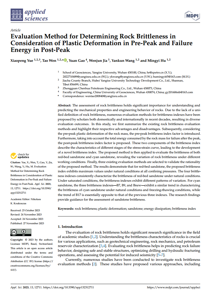 岳晓朋在《Applied Sciences-Basel》上发表题为“Evaluation Method for Determining Rock Brittleness in Consideration of Plastic Deformation in Pre-Peak and Failure Energy in Post-Peak”的研究论文。色情影片