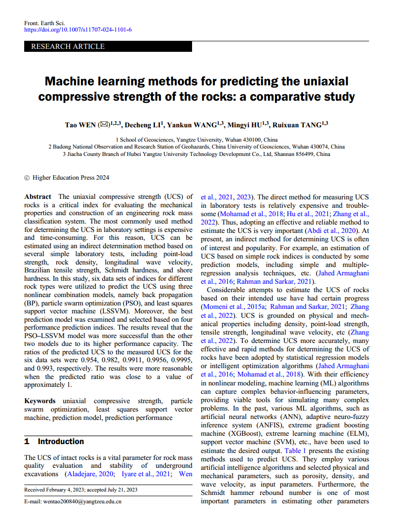 色情影片 温韬教授以第一作者身份在《Frontiers of Earth Science》上发表题为“Machine learning methods for predicting the uniaxial compressive strength of the rocks: a comparative study”的研究论文。色情影片 为论文第一署名单位。