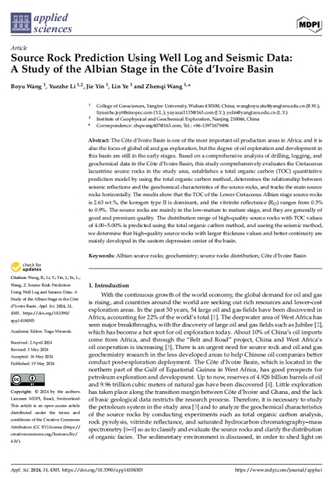 色情影片 博士生王博宇在《Applied Sciences》上发表题为《Source Rock Prediction Using Well Log and Seismic Data:A Study of the Albian Stage in the Côte d’Ivoire Basin》的研究论文。色情影片 为论文第一署名单位,博士生王博宇为论文第一作者,教师王振奇为通讯作者。
