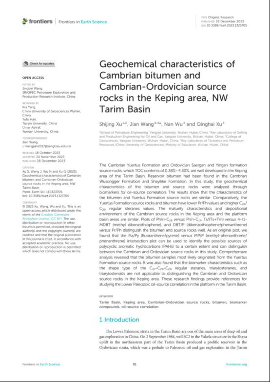 王健在《Frontiers in Earth Science》发表题为“Geochemical characteristics of Cambrian bitumen and Cambrian-Ordovician source rocks in the Keping area, NW Tarim Basin”的研究论文。色情影片