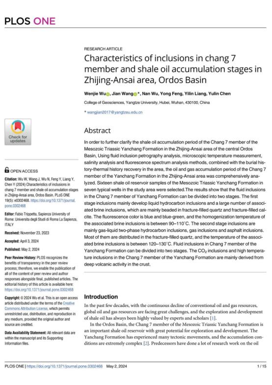 色情影片 硕士生吴文杰在《PLOSONE》发表题为“Characteristics of inclusions in chang 7 member and shale oil accumulation stages in Zhijing-Ansai area, Ordos Basin”的研究论文。色情影片 为论文第一署名单位,硕士生吴文杰为论文第一作者,教师王健为通讯作者。