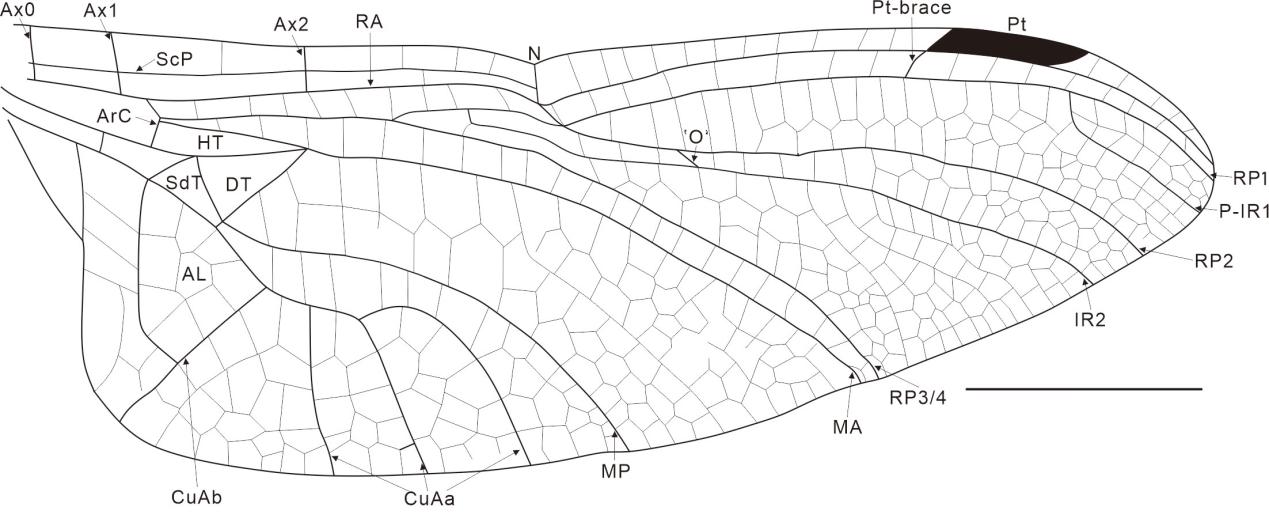 图2 酒泉拟昼蜓化石线条图,比例尺= 5 mm.
