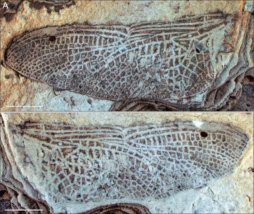 图1 酒泉拟昼蜓化石照片,比例尺= 5 mm.