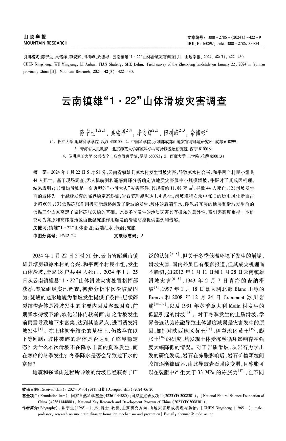 陈宁生教授团队在《山地学报》上发表题为“云南镇雄‘1·22’山体滑坡灾害调查”的论文。陈宁生教授为第一作者,色情影片