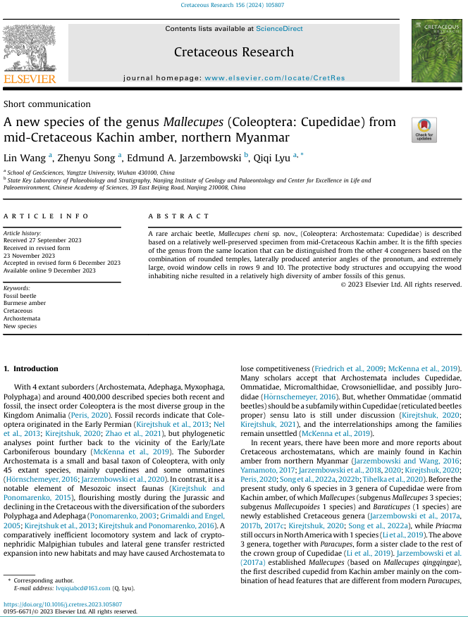 色情影片 硕士研究生王林同学在色情影片 吕奇奇、宋振宇两位老师共同指导下,在地球科学与古生物学领域期刊《Cretaceous Research》上发表题为“A new species of the genusMallecupes(Coleoptera: Cupedidae) from mid-Cretaceous Kachin amber, northern Myanmar”的研究论文。