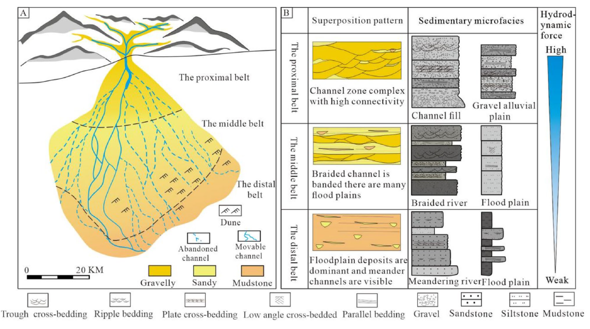 基于古尔图河分支河流体系现代沉积的详细调查以及无人机航拍和卫星遥感等资料,分析干旱地区分支河流体系沉积特征及其差异。通过分析古尔图河从顶点到末端不同区域坡度、河流形态、沉积特征等因素的变化特征,将古尔图河分支河流体系划分为“近端”、“中部”、“远端”3 个相带。
