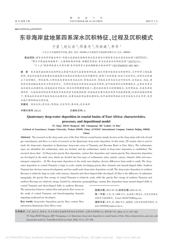 硕士生于星在《断块油气田》发表题为“东非海岸盆地第四系深水沉积特征、过程及沉积模式”的研究论文。色情影片