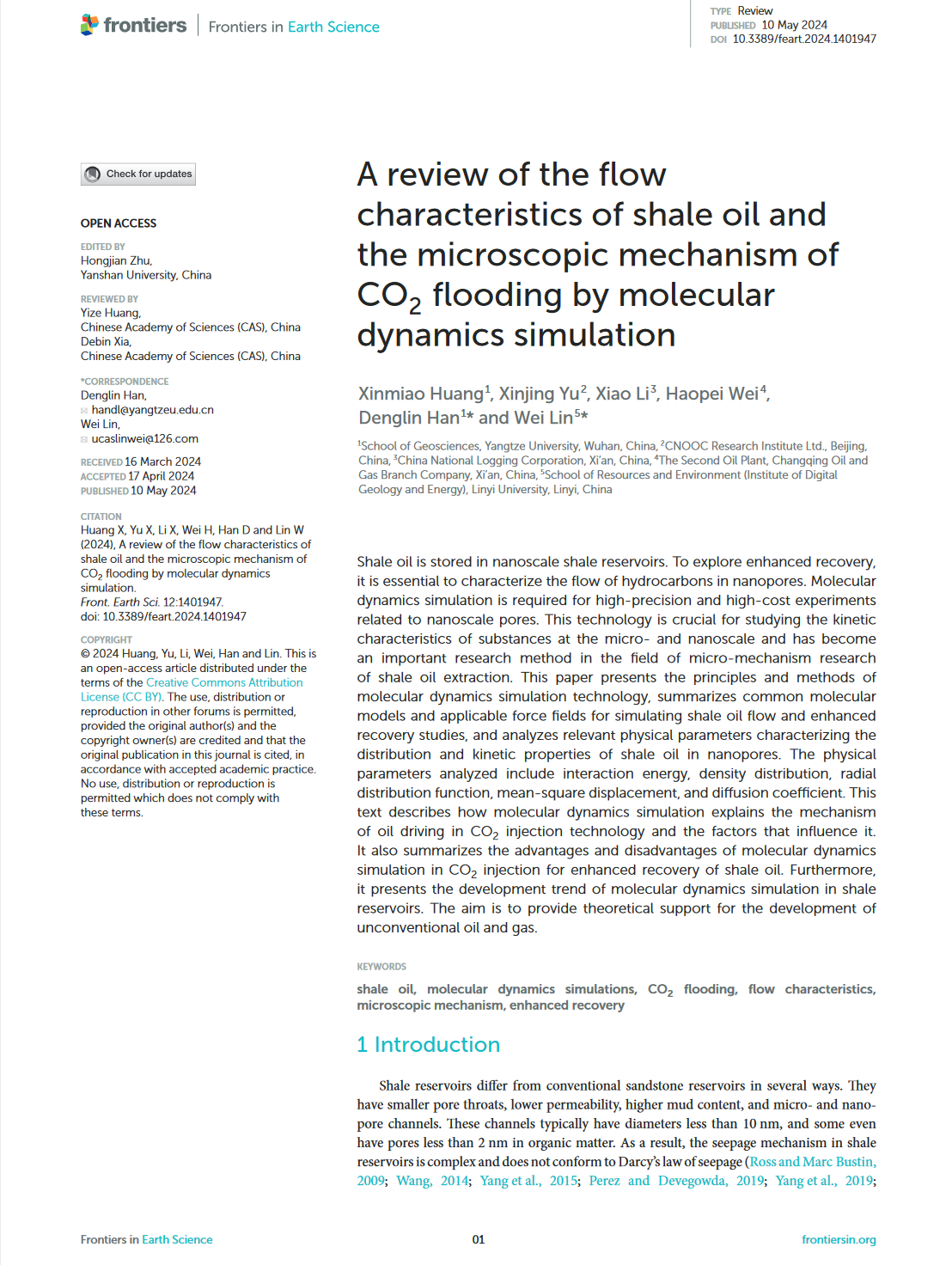 硕士研究生黄鑫淼在《Frontiers in Earth Science》发表了题为“A review of the flow characteristics of shale oil and the microscopic mechanism of CO2 flooding by molecular dynamics simulation”的综述论文,色情影片