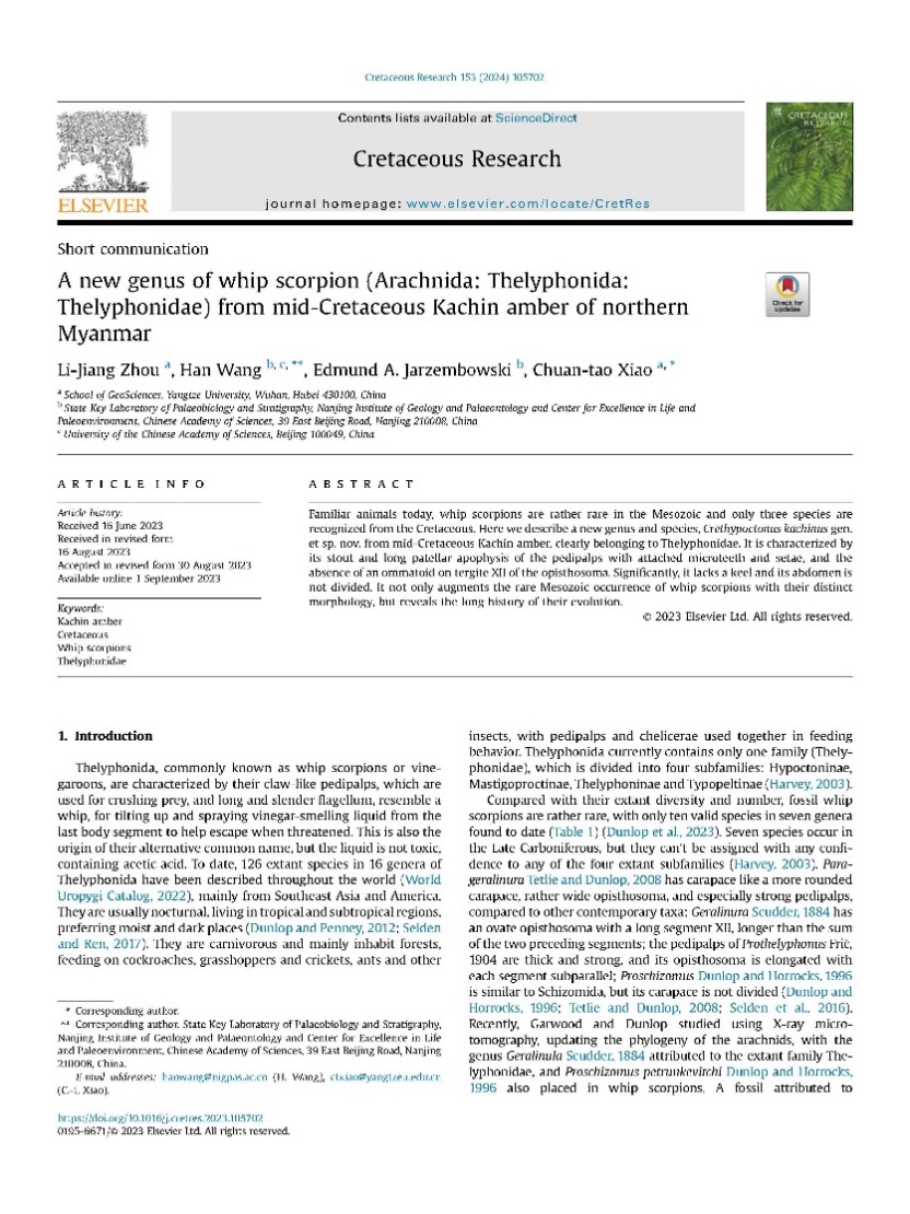 硕士周利将在地球科学与古生物学领域期刊《Cretaceous Research》上发表题为“A new genus of whip scorpion (Arachnida: Thelyphonida: Thelyphonidae) from mid-Cretaceous Kachin amber of northern Myanmar”的研究论文。色情影片