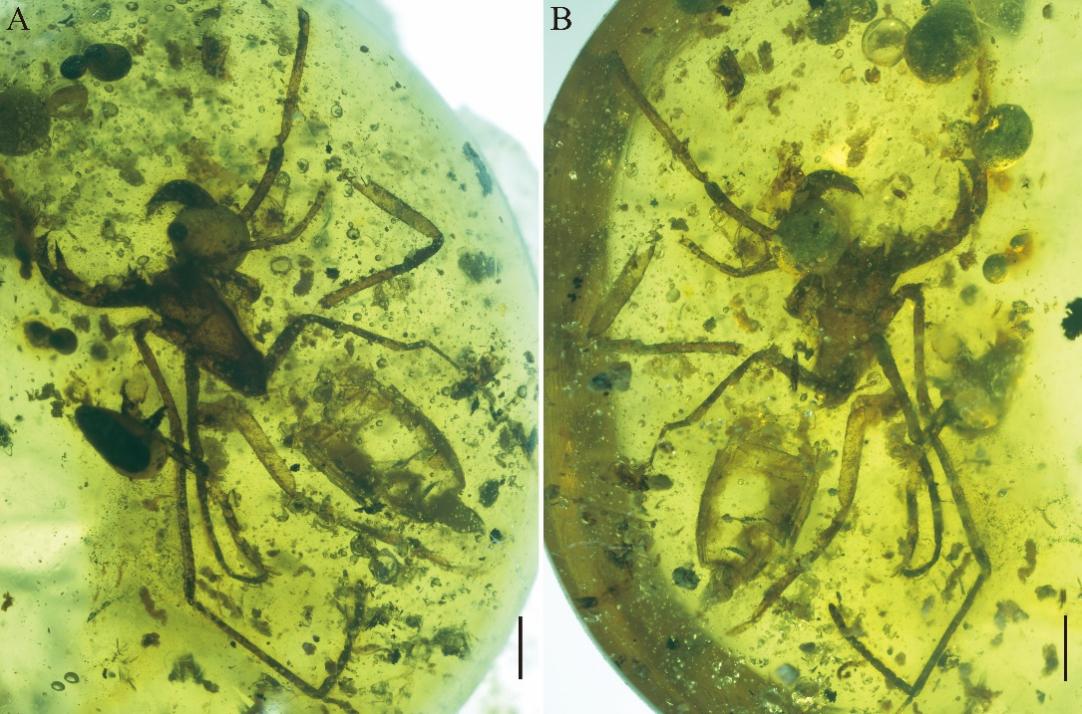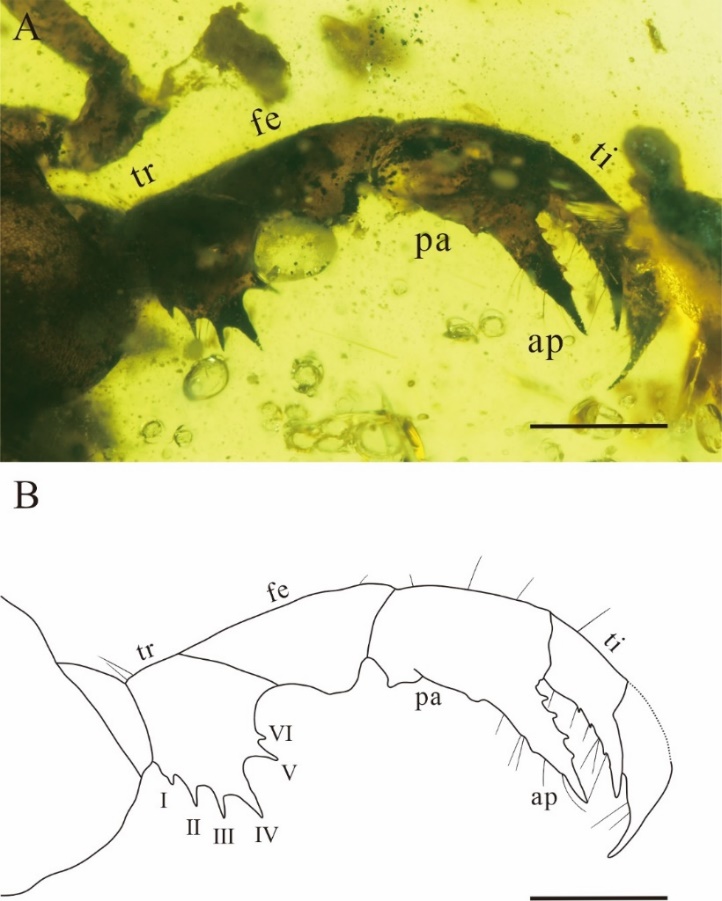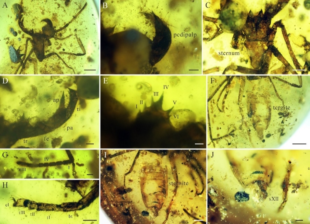 有鞭目(鞭蝎)作为蛛形纲成员之一,主要发现于热带和亚热带地区。该类群通常昼伏夜出,喜阴暗潮湿环境,常见于森林生态系统。与有鞭目现存物种多样性相比,其化石相当罕见,迄今为止只发现7属10种,七种来自晚石炭世,三种发现于白垩纪。其中,缅甸克钦琥珀中仅有过两次相关报道,这无疑为其系统发育史蒙上神秘面纱。因此,寻找有鞭目化石并进行物种鉴定,对构建完善有鞭目进化史以及重建白垩纪中期缅甸森林生态系统具有重要意义。