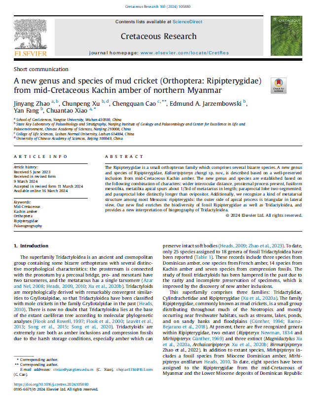 地质学专业硕士研究生赵金阳同学在在地学综合研究领域期刊《Cretaceous Research》上发表题为“A new genus and species of mud cricket (Orthoptera: Ripipterygidae) from mid-Cretaceous Kachin amber of northern Myanmar”的研究论文(图1)。色情影片
