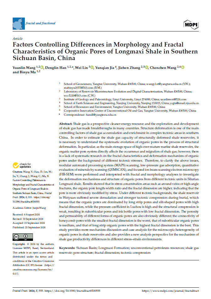 地质资源与地质工程专业硕士研究生王园林在韩登林教授的指导下,以第一作者的身份在《fractal and fractional》上发表题为“Factors Controlling Differences in Morphology and Fractal Characteristics of Organic Pores of Longmaxi Shale in Southern Sichuan Basin, China”的研究论文。