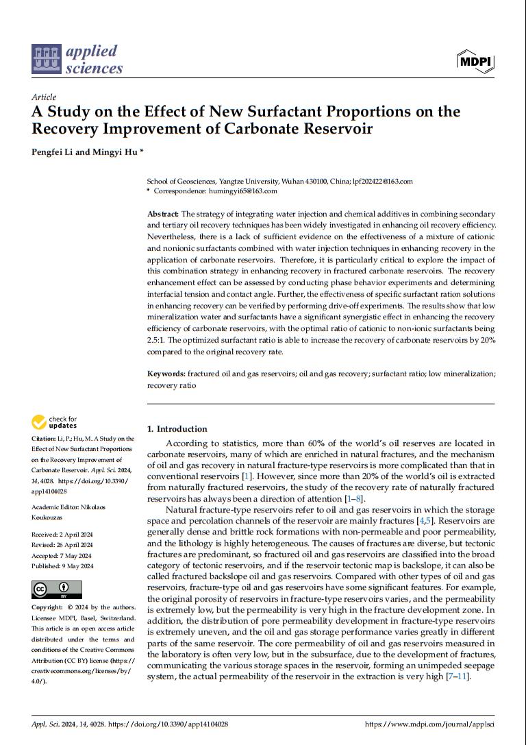 2021级硕士生李鹏飞在期刊《Applied Sciences》上发表了题为“A Study on the Effect of New Surfactant Proportions on the Recovery Improvement of Carbonate Reservoir”的研究论文。色情影片