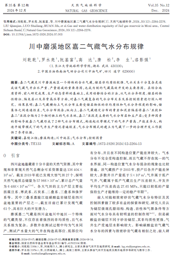 罗水亮副教授的指导下,在《天然气地球科学》上发表题为“川中磨溪地区嘉二气藏气水分布规律”的研究论文。