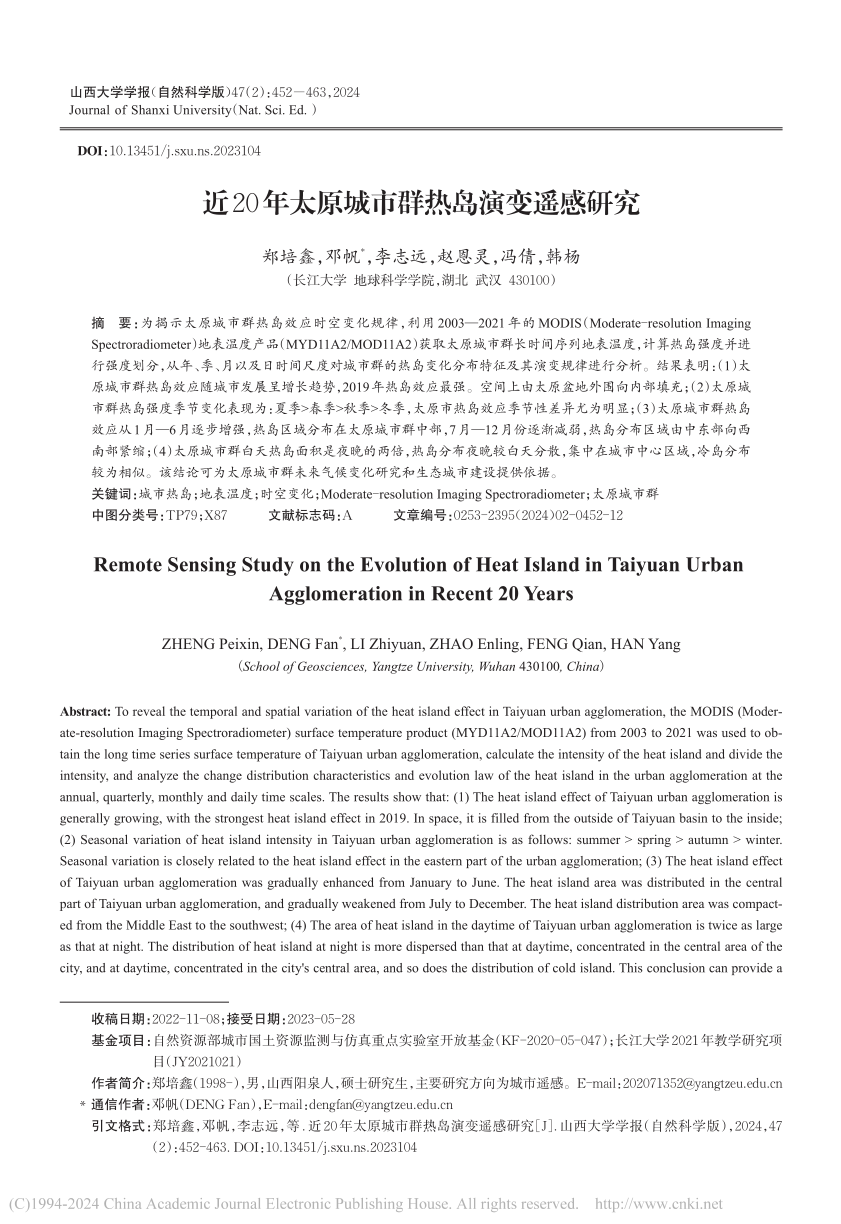 硕士生郑培鑫在北大核心期刊《山西大学学报》(自然科学版)发表题目为“近20年太原城市群热岛演变遥感研究”的研究论文。色情影片