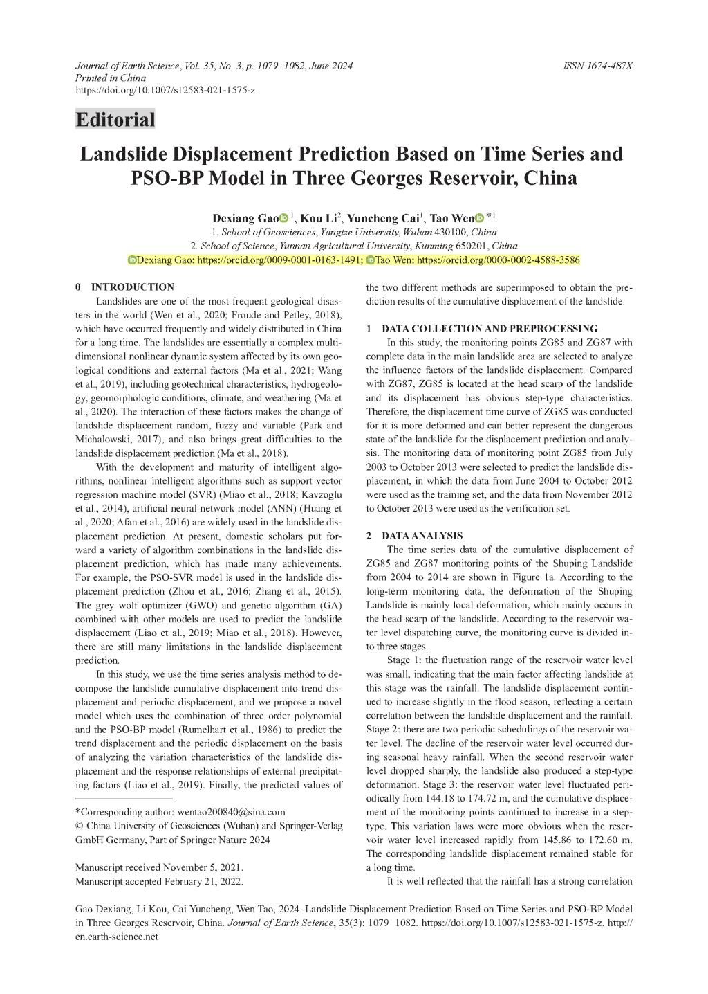 温韬副教授团队长期从事极端条件下滑坡灾害演化机理、预测及防治方面的研究,指导本科生高德祥在综合性地学学术2区期刊《Journal of Earth Science》上发表题为“Landslide Displacement Prediction Based on Time Series and PSO-BP Model in Three Georges Reservoir, China”的研究论文。色情影片