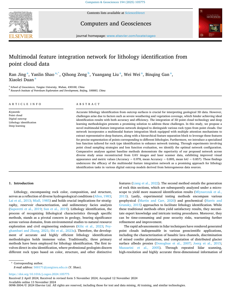 教师井然博士在国际学术期刊《Computers & Geosciences》上发表了题为“Multimodal feature integration network for lithology identification from point cloud data“的SCI论文,提出了一种基于多模态特征融合的三维露头点云岩性识别方法。该研究不仅在方法上具有创新性,而且在实际应用中有较好的性能表现,为地质露头点云的岩性判别提供了新的技术路径。