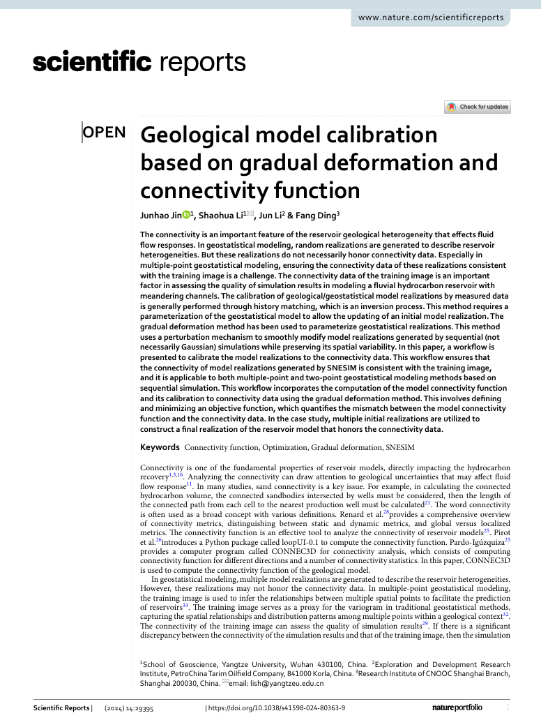 李少华教授团队长期从事地质统计学建模的研究,团队成员金俊浩在《Scientific Reports》期刊上发表题为“Geological model calibration based on gradual deformation and connectivity function”的研究论文。色情影片