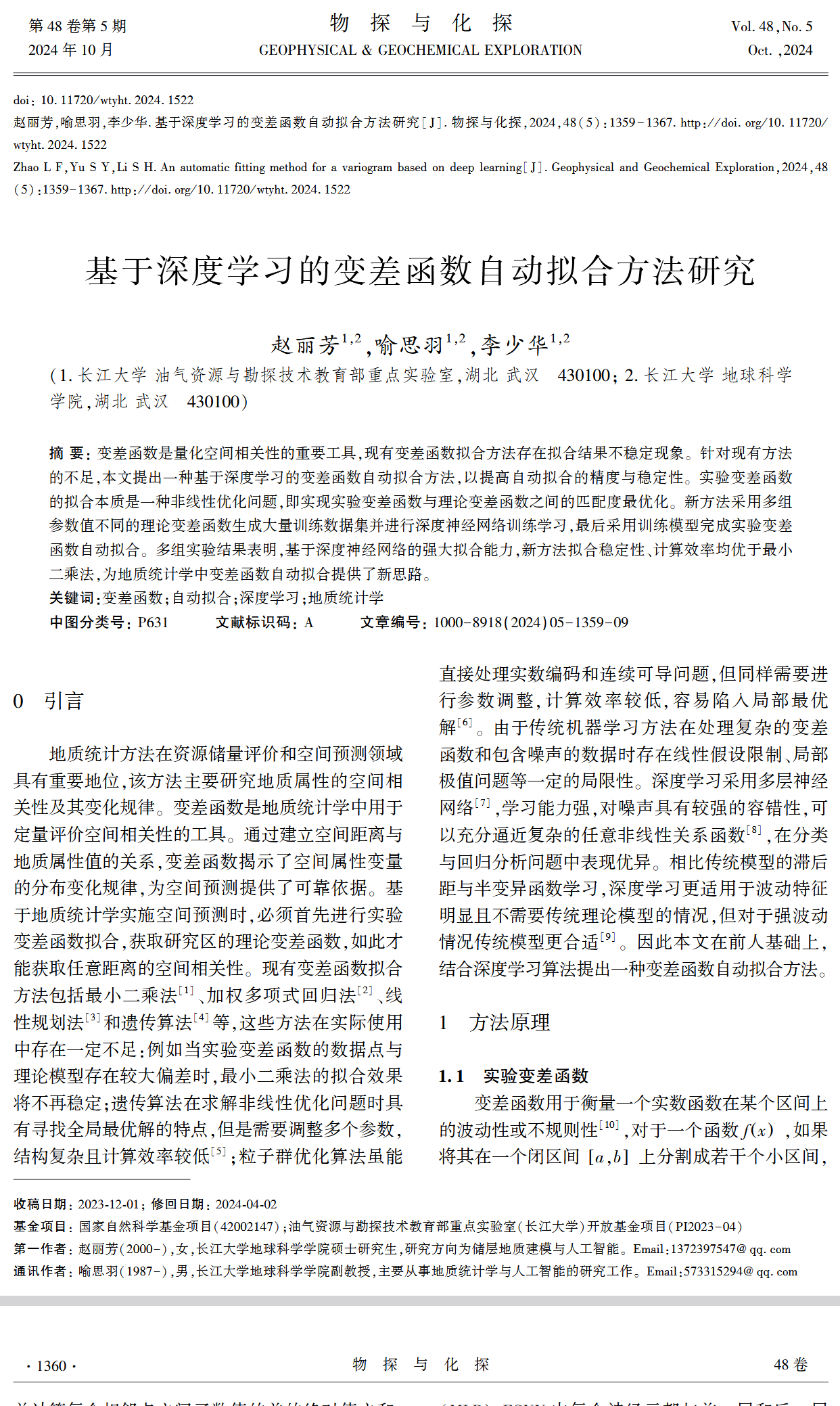 硕士研究生赵丽芳在喻思羽副教授的指导下,在期刊《物探与化探》上发表题为“基于深度学习的变差函数自动拟合方法研究”的论文,色情影片