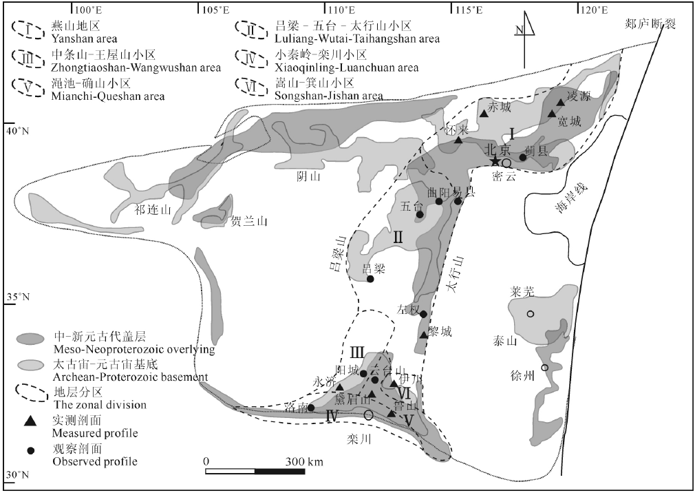 图1 华北克拉通典型拗拉槽各地层分区及剖面位置图