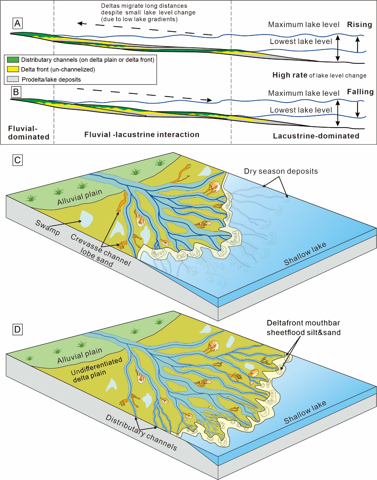 浅水湖盆河湖交互沉积体系是一种复杂、复合的沉积体系,在湖岸线从枯水线-平水线-洪水线的频繁迁移、变化过程中,导致河流相、三角洲、湖相沉积类型的相互转化、单一沉积体系属性(类型、特征、模式)变化。浅水湖盆中河流与湖泊在交互区水体条件频繁转换,其作用下沉积模式、油气富集也不同于传统河流与三角洲沉积体系。论文以典型现代浅水湖泊鄱阳湖和渤海海域新近系浅水古湖盆为解剖对象,建立河控主体区、河湖交互区、湖泊主体区沉积单元划分标准及特征,揭示了河湖交互沉积体系与湖平面变化动态耦合关系,建立了基于现代沉积野外考察、地下地质表征的浅水河湖交互沉积模式,指导陆相盆地浅水湖盆规模性岩性地层油气藏勘探。