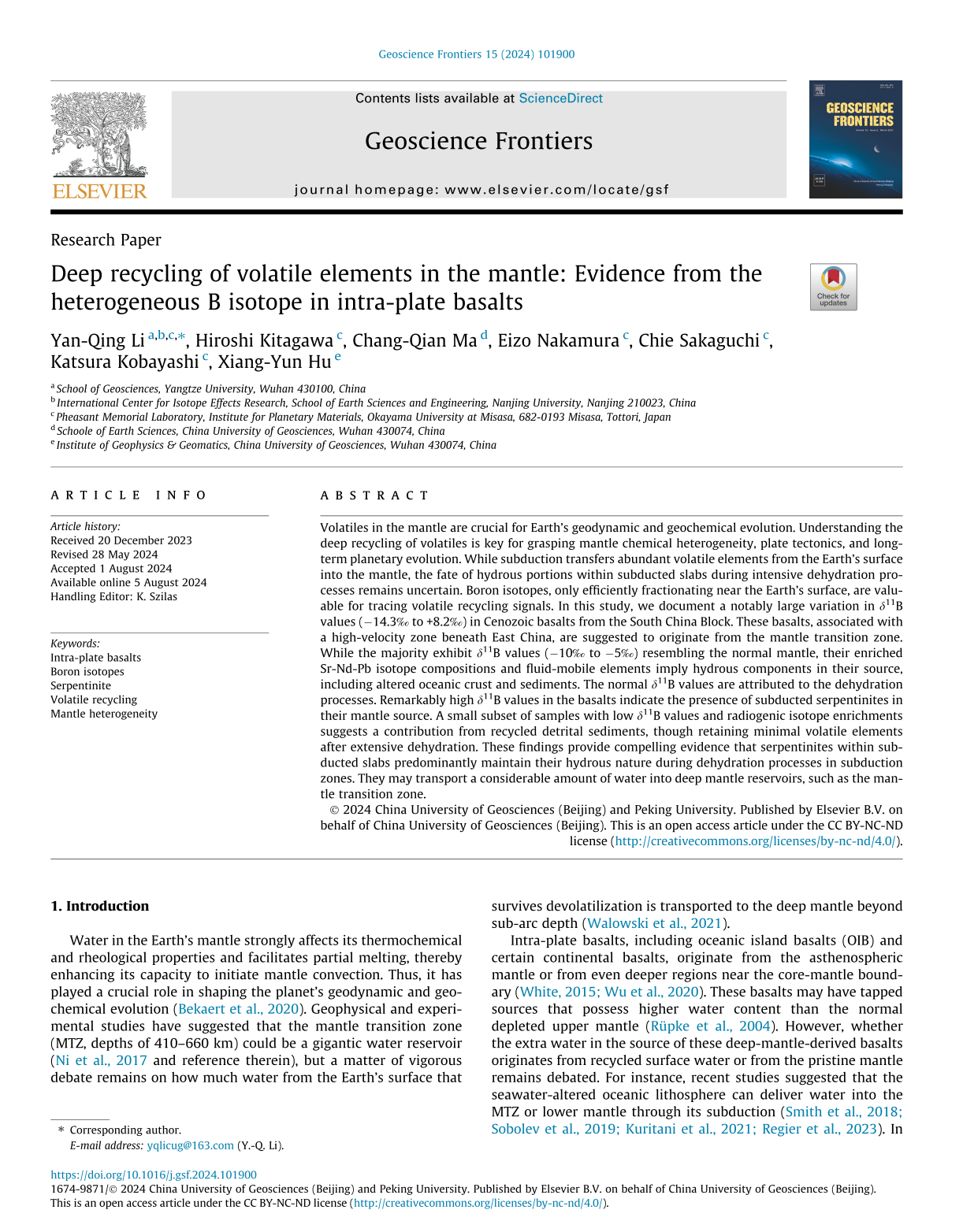地科系教师李艳青在期刊《Geoscience Frontiers》上发表题为《Deep recycling of volatile elements in the mantle: Evidence from the heterogeneous B isotope in intra-plate basalts》的研究论文。