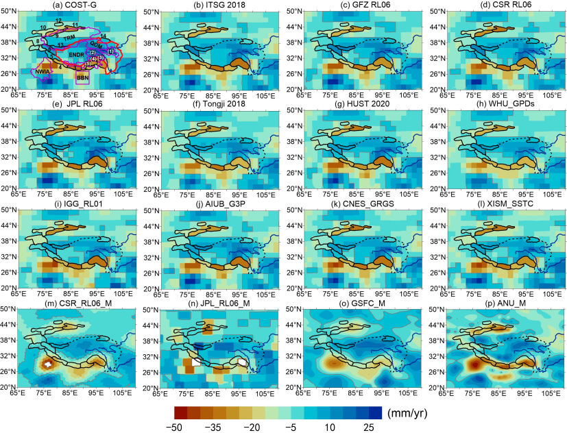 图1.基于16种不同GRACE解估算青藏高原及其周边14个冰川区和10个流域TWSC变化趋势