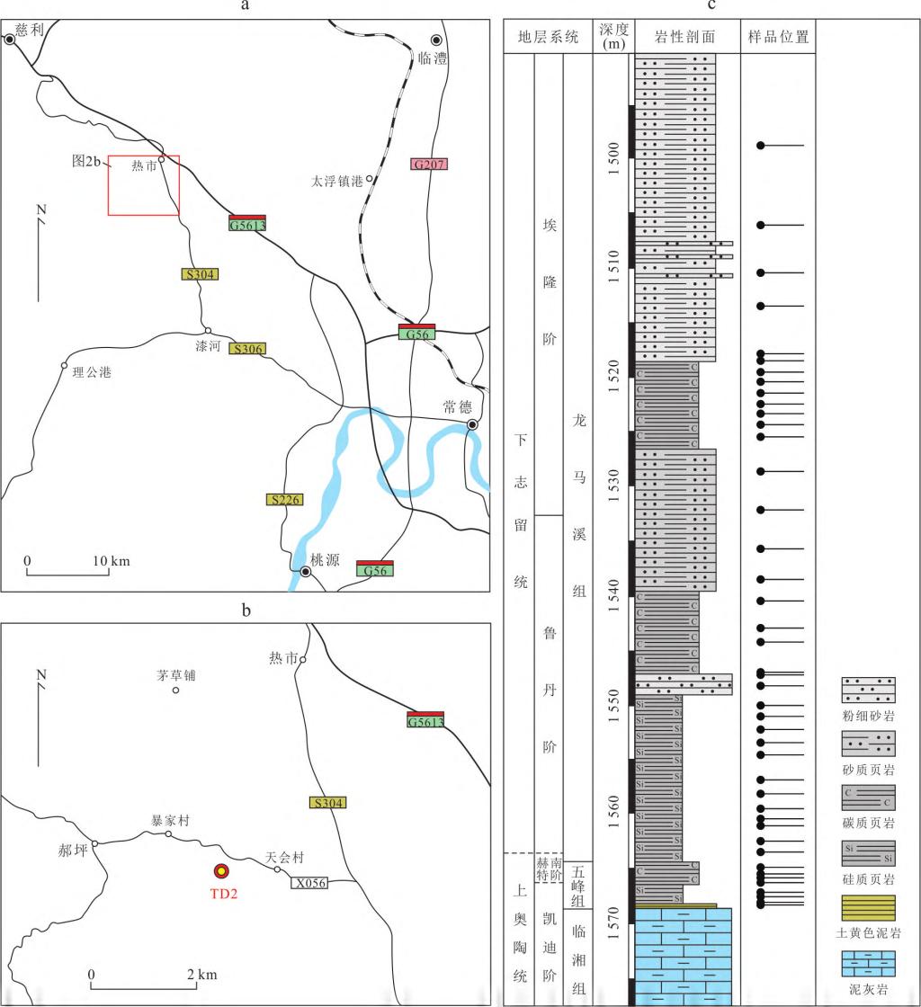图1湘西前陆盆地区TD2井钻井剖面位置(a、b)与五峰组-龙马溪组采样位置(c)
