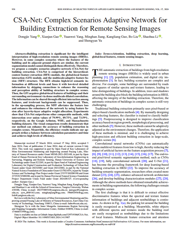 杨栋杰博士在郭康良教授和高贤君副教授的指导下,在成像科学和摄影技术主流期刊《IEEE JOURNAL OF SELECTED TOPICS IN APPLIED EARTH OBSERVATIONS AND REMOTE SENSING》上发表题为“CSA-Net: Complex Scenarios Adaptive Network for Building Extraction for Remote Sensing Images”的研究论文。