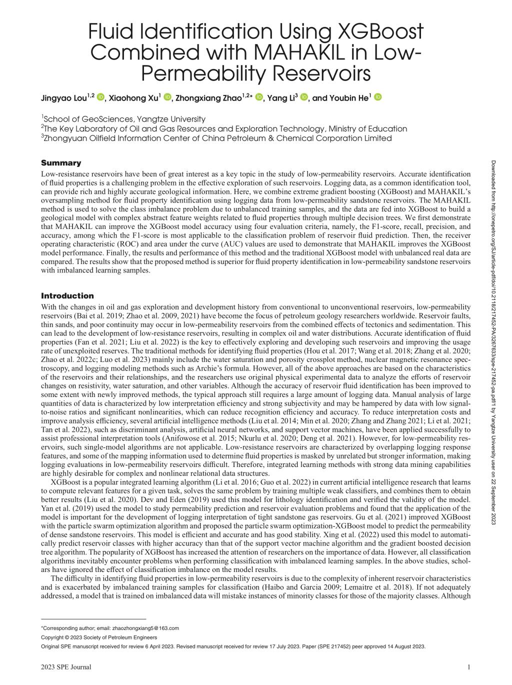 娄静瑶博士在石油领域重要期刊《SPE JOURNAL》上发表题为“Fluid Identification Using XGBoost Combined with MAHAKIL in Low- Permeability Reservoirs”的研究论文。色情影片