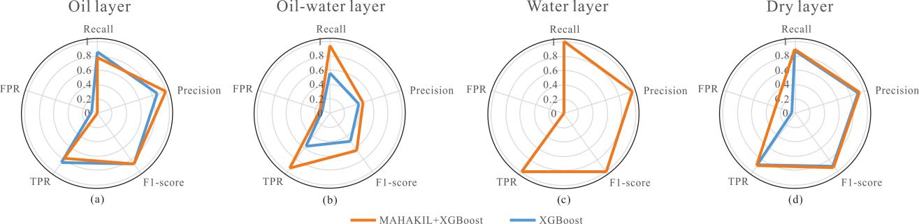 该研究选取中国松辽盆地古龙油田姚一段葡萄花组油层为验证对象,将XGBoost和MAHAKIL的过采样方法结合,利用低渗砂岩储层的测井数据进行流体性质识别(图1)。采用MAHAKIL方法解决训练样本不平衡导致类不平衡的问题,将数据输入XGBoost,通过多个决策树建立复杂测井曲线特征与流体性质相关响应权重的地质模型。首先,利用F1-Score、Recall、Precision和Accuracy四个评价标准证明经过MAHAKIL过采样后的XGBoost模型在流体识别方面表现优于未处理数据的XGBoost模型。在不平衡数据集的情况下,MAHAKIL提高了模型的识别精度,且F1-score更适用于储层流体预测的分类问题(图2a)。其次,用ROC和AUC的值证明了MAHAKIL提高了XGBoost的性能(图2b)。最后,将该方法和传统的XGBoost模型在类不平衡的实际数据上的应用结果和性能进行对比。结果表明,该方法在训练样本不平衡的情况下,对低渗砂岩储层的流体性质识别具有优越性(图3)。