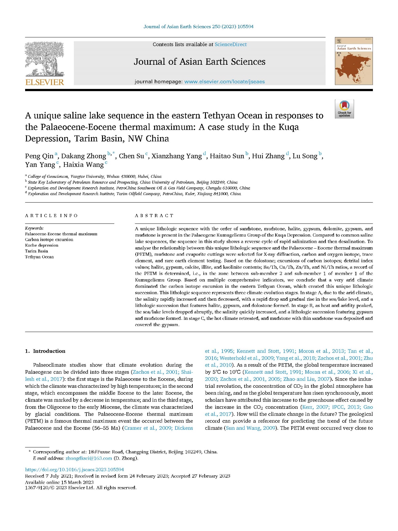 秦鹏博士以第一作者的身份在Journal of Asian Earth Sciences上发表题目为《A Unique saline lake sequence in the eastern Tethyan Ocean in Responses to the Palaeocene – Eocene Thermal maximum: A Case Study in the Kuqa Depression, Tarim Basin, NW China》的论文。