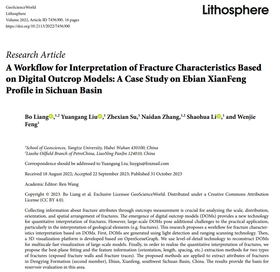 硕士生梁博在地学期刊《Lithosphere》上发表了题为“A Workflow for Interpretation of Fracture Characteristics Based on Digital Outcrop Models: A Case Study on Ebian Xianfeng Profile in Sichuan Basin”的研究论文。色情影片
