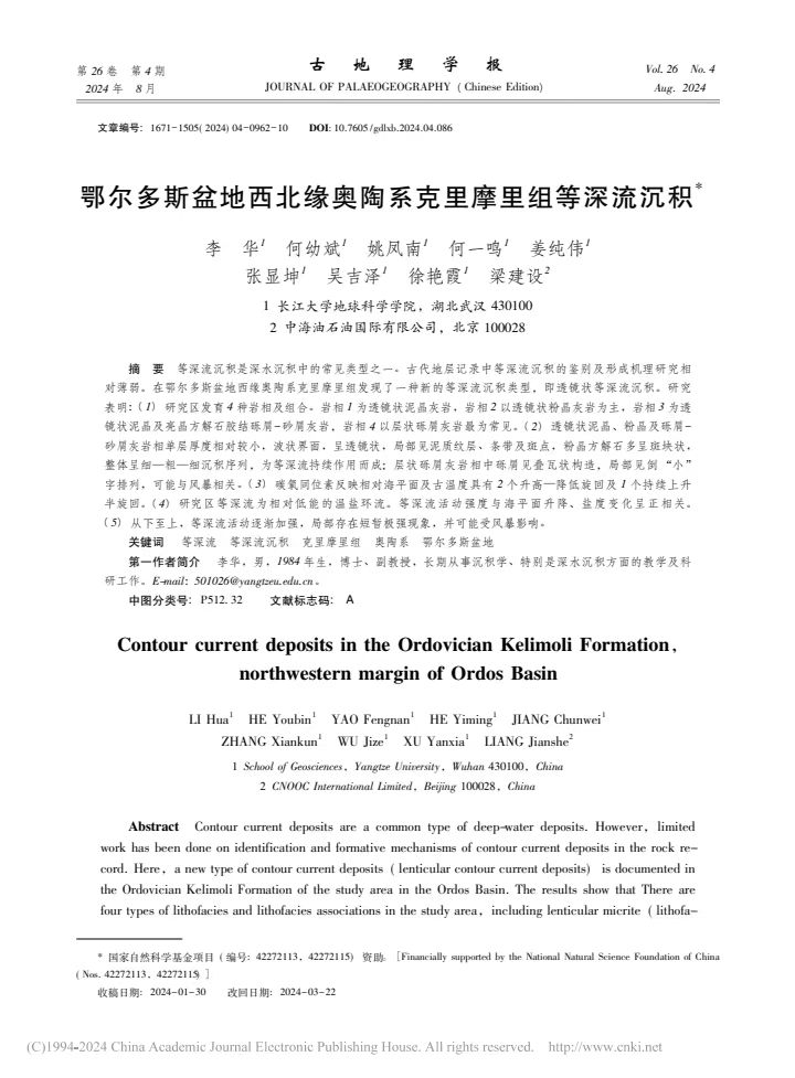 教师李华博士在《古地理学报》上发表题为“鄂尔多斯盆地西北缘奥陶系克里摩里组等深流沉积”的研究论文。