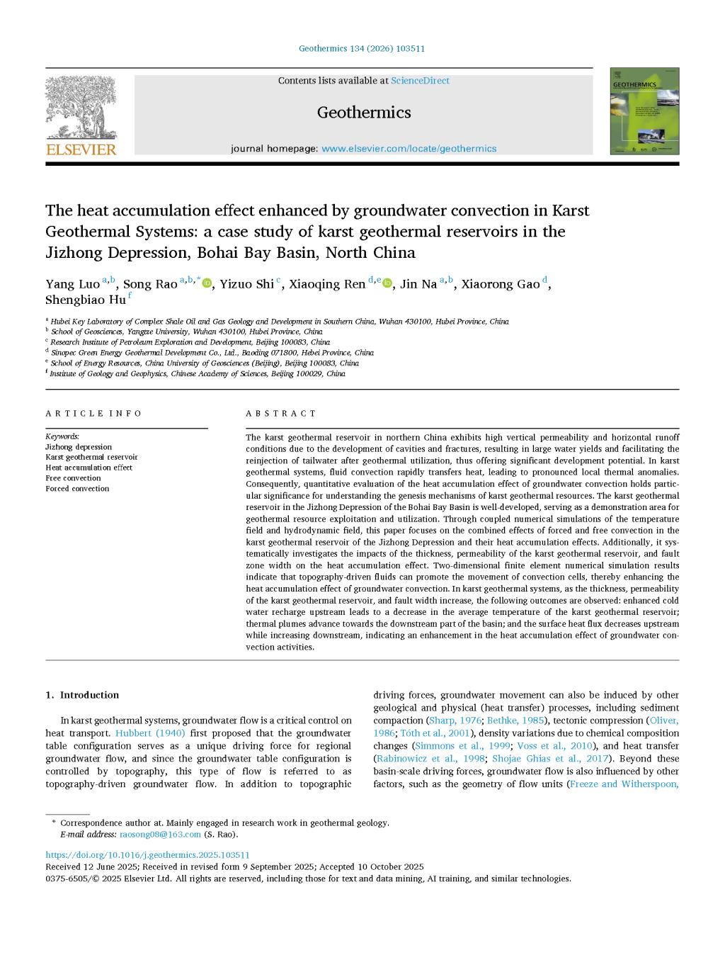 硕士生罗洋在饶松教授的指导下,在期刊《Geothermics》上发表题为“The heat accumulation effect enhanced by groundwater convection in karst geothermal systems: a case study of karst geothermal reservoirs in the jizhong depression, bohai bay basin, north China”的研究论文,色情影片