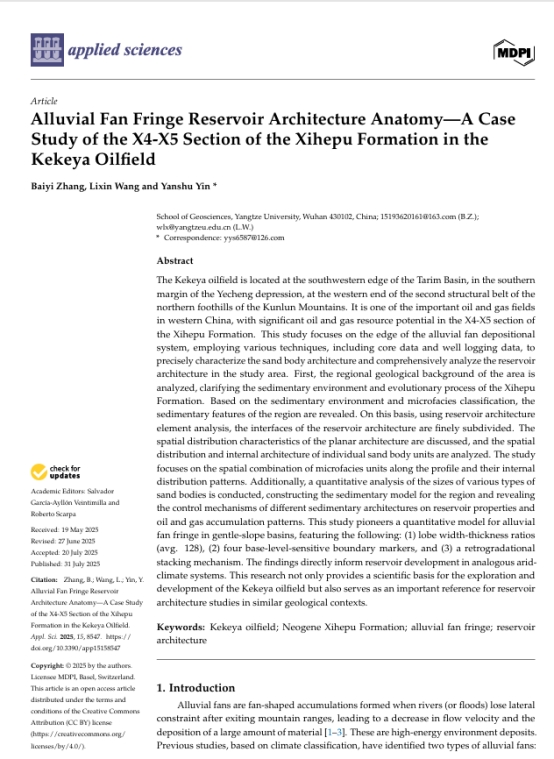 硕士生张佰义在SCI收录期刊《Applied Sciences》上发表题为“Alluvial Fan Fringe Reservoir Architecture Anatomy — A Case Study of the X4-X5 Section of the Xihepu Formation in the Kekeya Oilfield”的研究论文。色情影片