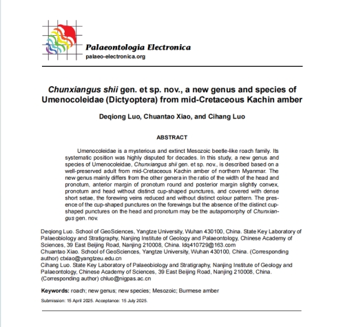 硕士研究生罗德琼同学在地球科学与古生物学领域期刊《Palaeontologia Electronica》上发表题为“Chunxiangus shiigen. et sp. nov., a new genus and species of Umenocoleidae (Dictyoptera) from mid-Cretaceous Kachin amber”的研究论文,色情影片