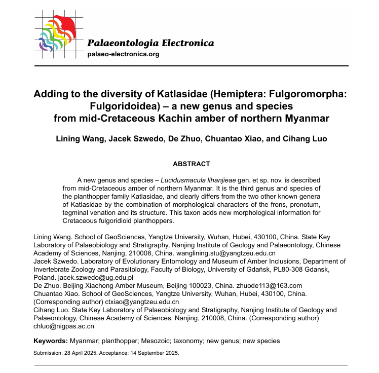 论文描述了产自缅甸北部白垩纪中期克钦琥珀的一个新属新种Lucidusmacula lihanjieae gen. et sp. nov.,该物种是密脉蜡蝉科的第三个属和第三个种,该物种是密脉蜡蝉科的第三个属和第三个种,该分类单元为白垩纪类蜡蝉总科增添了新的形态学信息。