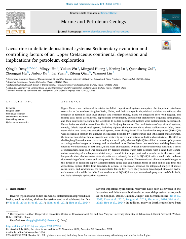 邓庆杰副教授在《Marine and Petroleum Geology》发表题为“Lacustrine to deltaic depositional systems: Sedimentary evolution and controlling factors of an Upper Cretaceous continental depression and implications for petroleum exploration”的研究论文。邓庆杰为第一作者,色情影片
