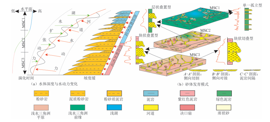 本文以松辽盆地北部昌德地区白垩系泉头组四段为研究对象,以沉积学为基础,综合利用测井、薄片、岩心和密井网解剖等手段,开展了浅水三角洲砂体结构特征及其控制因素的研究。研究表明:①研究区泉四段发育浅水三角洲—浅湖沉积体系,分析了其岩性、沉积构造及水动力特征。②系统划分出四种砂体垂向结构类型(块状切叠型、块状叠置型、层状叠置型、单一孤立型)和三种侧向接触关系(侧向切割、侧向对接、泥岩间隔),并剖析了各类砂体的物性、连通性及其对储层非均质性的影响。③从古气候、基准面变化和水动力条件三个角度,深入探讨了砂体结构的形成机制。指出古气候控制沉积物供给,基准面变化影响可容纳空间,水动力条件决定砂体建造与改造过程,三者共同控制砂体结构演化(图2)。④结合层序地层与沉积演化,建立了昌德地区泉四段浅水三角洲砂体发育模式,明确了不同时期砂体结构演变规律及其对油气储集性的影响。本研究对昌德地区致密砂岩油气藏的精细勘探与高效开发具有指导意义。